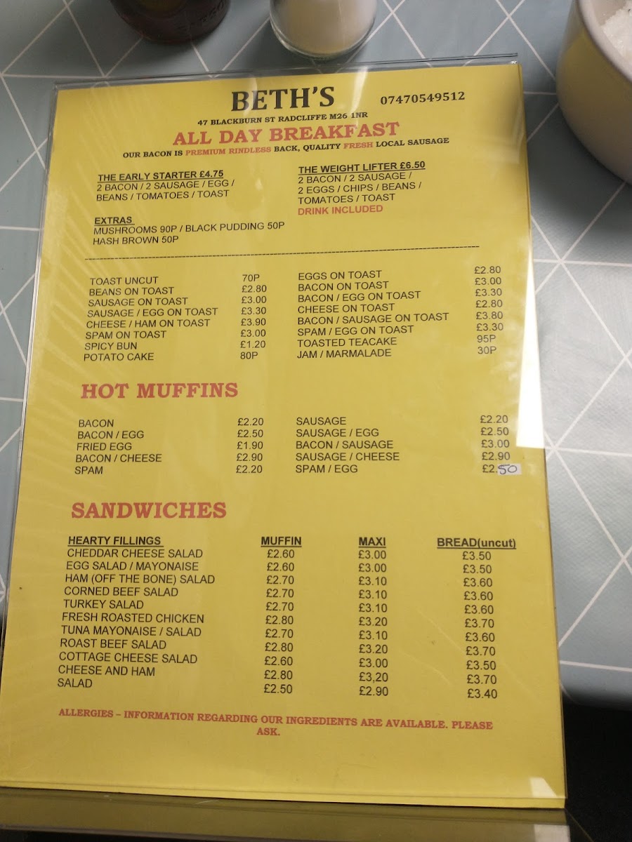 - Main Courses: Options in this category include traditional dishes such as Greenhalgh's Pies, Plate Meat Pie, and combinations like Ham, Eggs and Chips, Egg and Chips, Bacon and Egg, Sausage and Egg, as well as Chilli Beef and Soup with a Roll, suitable for breakfast or lunch.